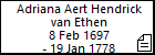 Anna Adriaan van Ierland• Geboren: 1 Nov 1765, Tilburg • Gehuwd: 2 Jun 1793, Tilburg, met Adriaan Cornelis Smits • Overleden: 26 Jan 1832, Tilburg (West-Heikant) • Bron(nen): RA Tilburg. Pagina/Aktenummers (101v, 164, 31) Geboorte: Getuige Maria Catharina van Ierlant. Huwelijk: Getuige Adriaen van Ierland (vader). Overlijden: Aangegeven door Cornelis Smits, wever, oud 36 jr (zoon). Mede-aangever Jan Baptist Rijnen, wever, oud 23 jr (gebuur). Allen wonende te Tilburg. | ||||